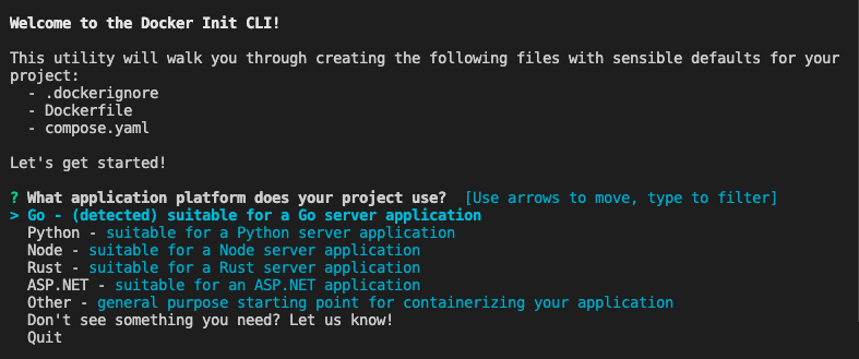 $ docker initThis command starts docker init in interactive mode and presents a list of application platforms to choose from: