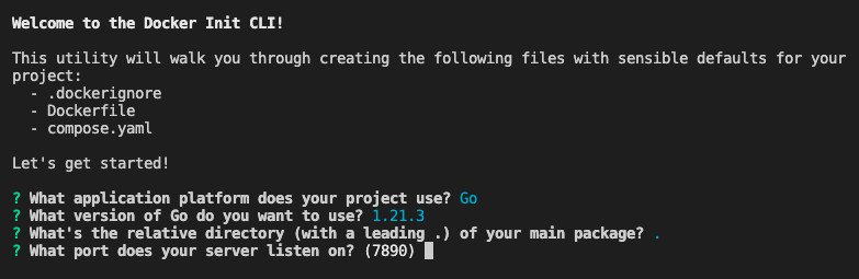 If you run docker init with no parameters, it goes into interactive mode and asks you to enter or select a few language-specific details. It automatically determines suitable default settings from your app, such as the language of your project (Go), the installed Go version, and even details like the HTTP port your app uses. You can choose to overwrite the suggested values, but the default values are usually adequate.