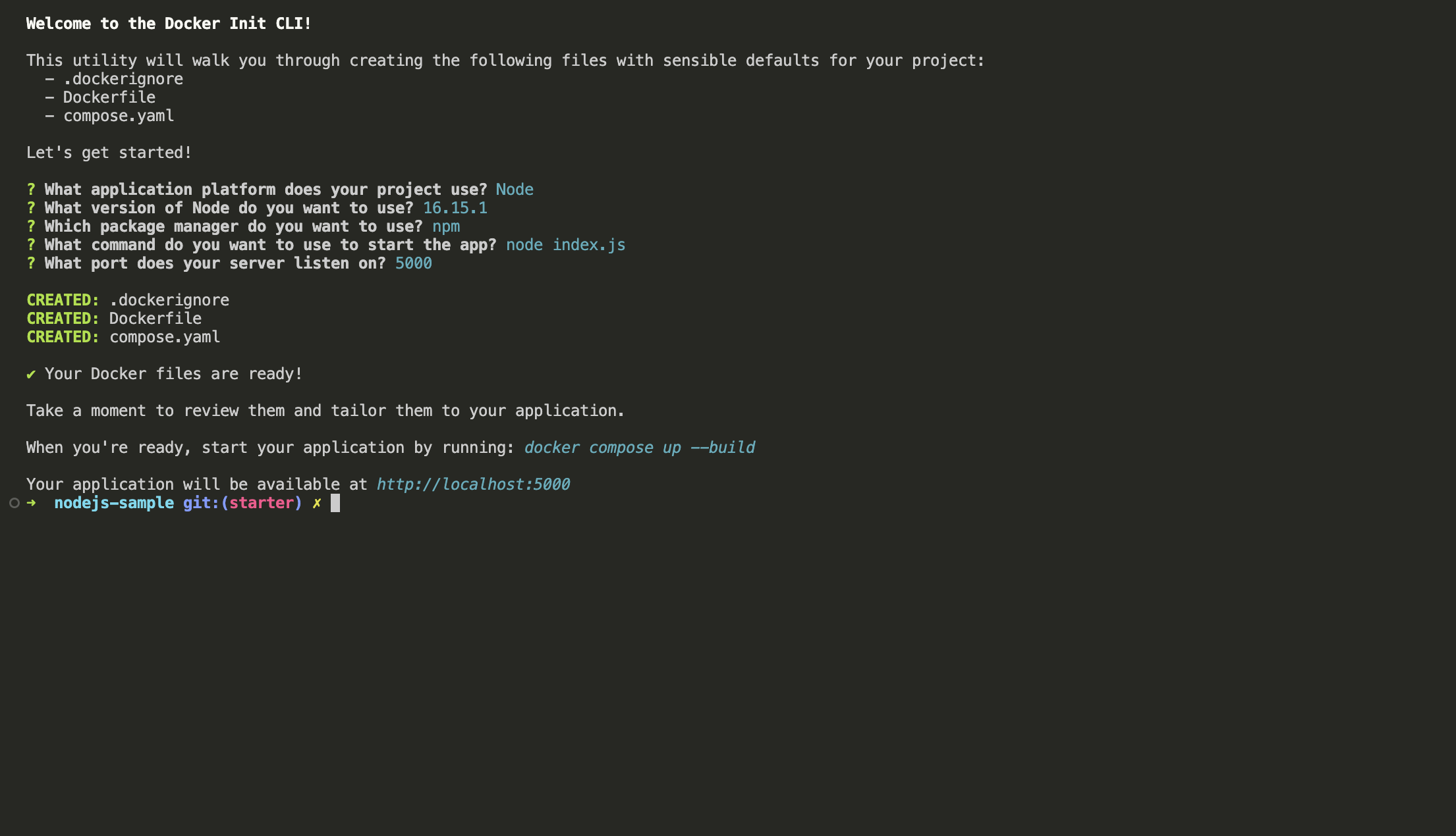 The docker initcommand expedites the process of launching your Node.js application within a Docker container, guaranteeing that the configuration is fine-tuned for a Node.js environment. As part of the Docker CLI, this command simplifies the process of Dockerizing your project by automatically generating essential files like Dockerfile, .dockerignore, and compose.yaml. This means you spend less time wrestling with configurations and more time focusing on your application logic.