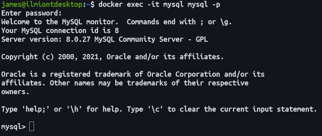 docker exec -it mysql mysql -pThis command runs mysql -p inside the mysql container. The -it flags mean your terminal’s input stream will be forwarded to the container as an interactive TTY.