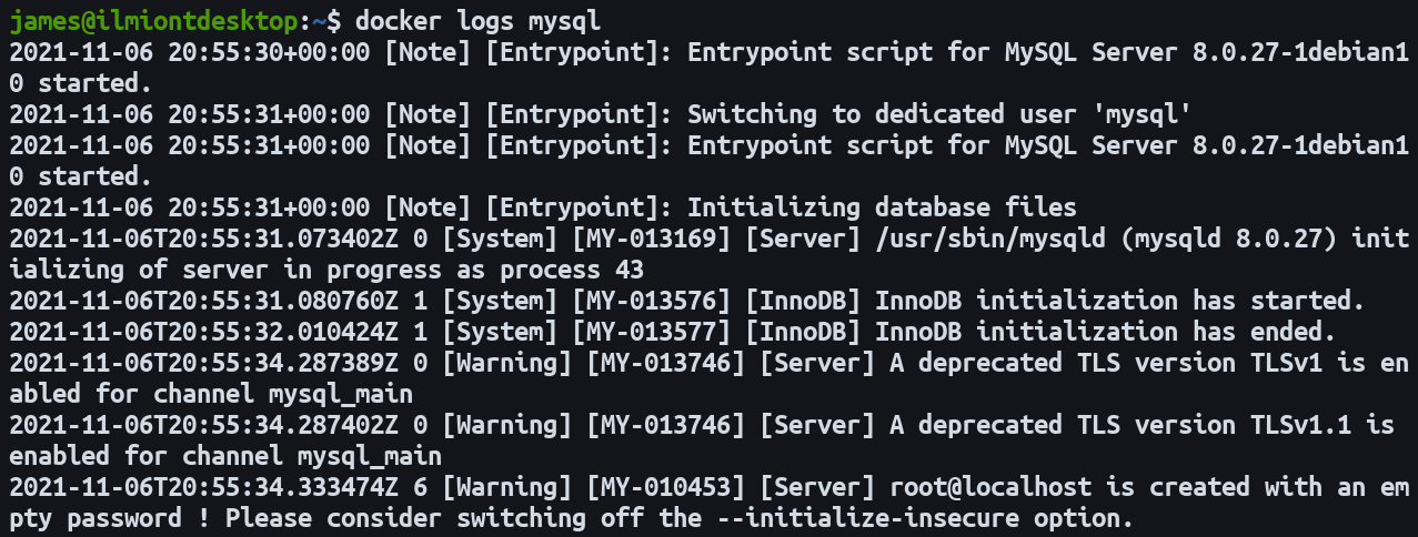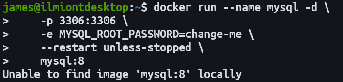 This command starts a container with MySQL 8. The password for the root user is set manually. The -d flag means the container will run in the background until it’s stopped, independently of your terminal session. You can view the container’s startup logs with docker logs mysql --follow. When “ready for connections” appears, your MySQL database is accessible.