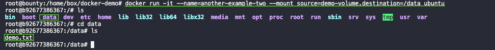 docker run -it --name=another-example-two --mount source=demo-volume,destination=/data ubuntuThe demo.txt file you created in the preceding container should list another-example in the output.