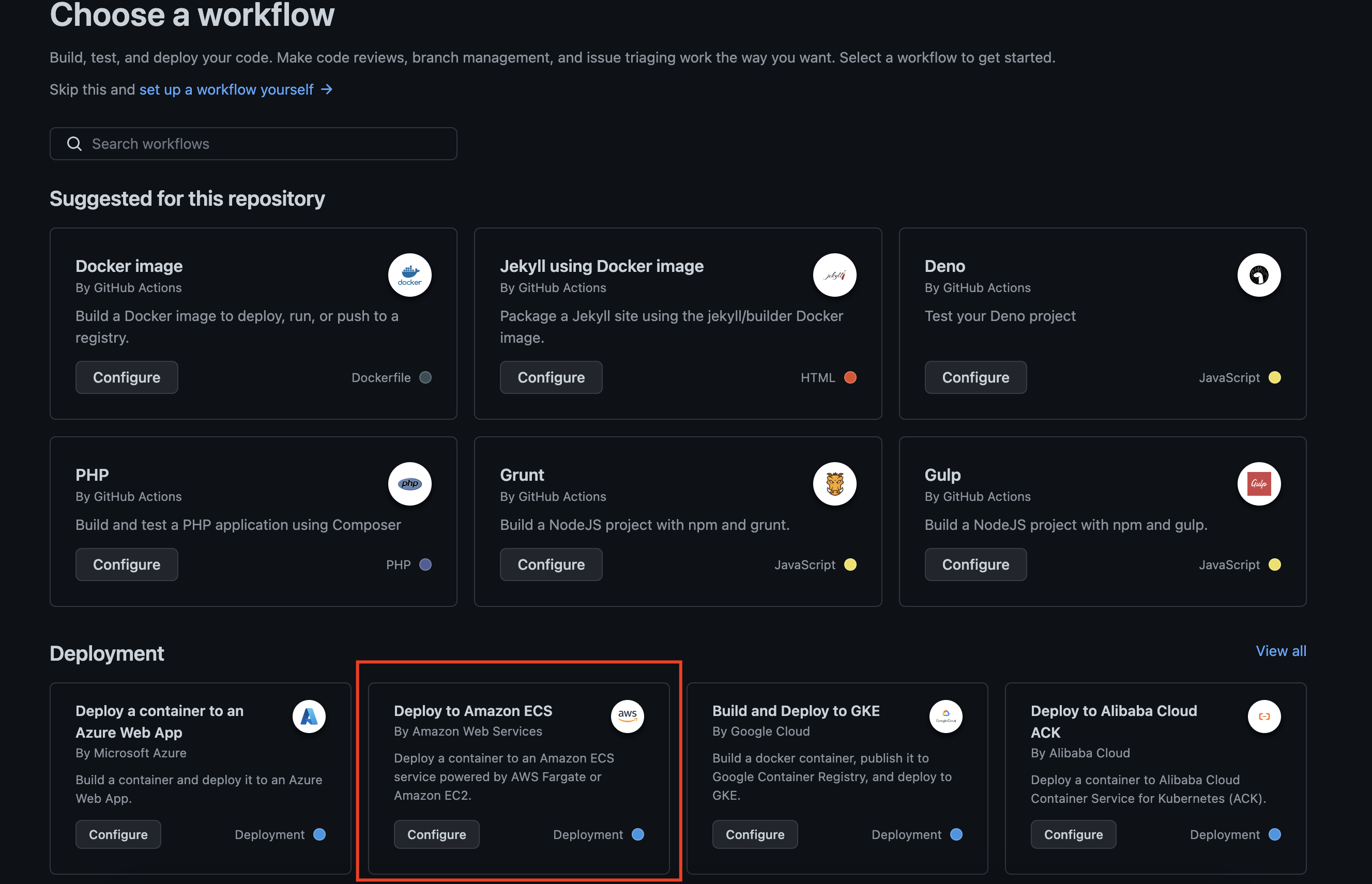 At this point, you have two options: you can either select any of the workflow examples/templates or create a new one from scratch. Here, the Deploy to Amazon ECS example was chosen under the Deployment template. This workflow example essentially deploys a container to an Amazon Elastic Container Service (Amazon ECS):
