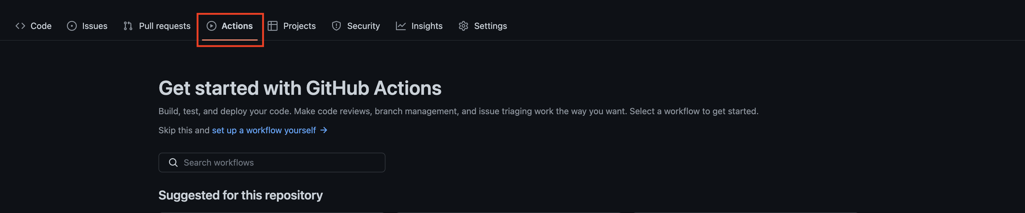 To create a workflow, log into your GitHub account and navigate to the repo you want to automate. Select Actions from the navigation bar, which will take you to the Actions page: