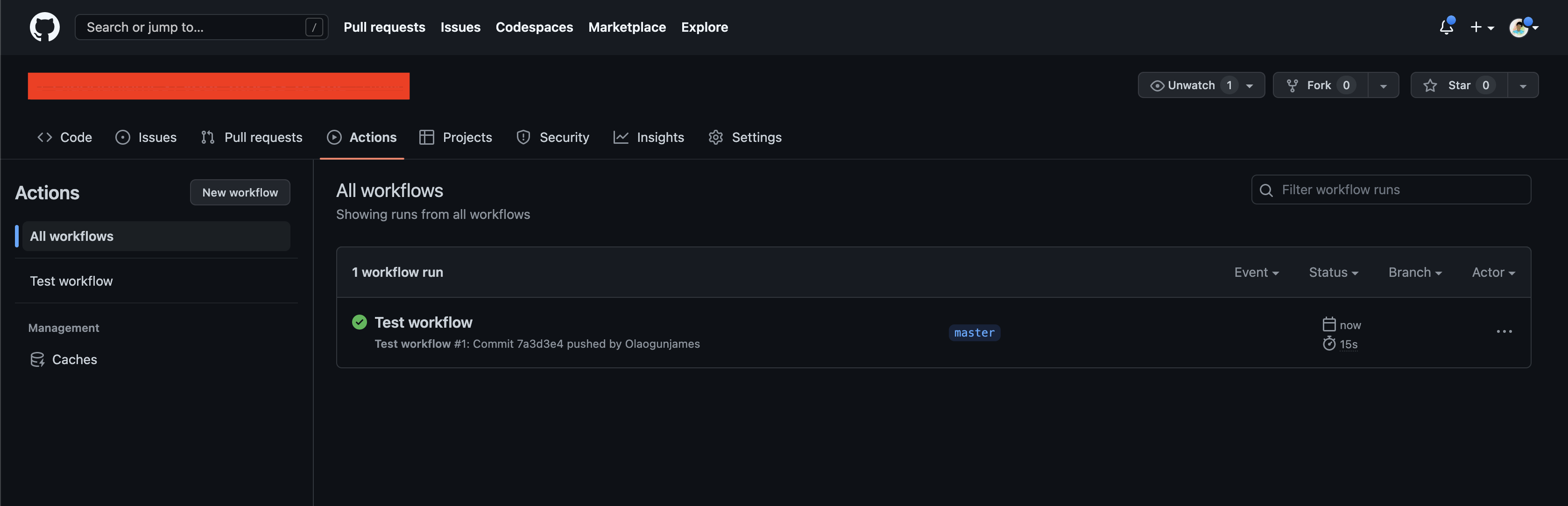 You can also monitor the progress of the workflow by visiting the Actions tab in your repository on GitHub and selecting a workflow that has previously been run or the currently running workflow: