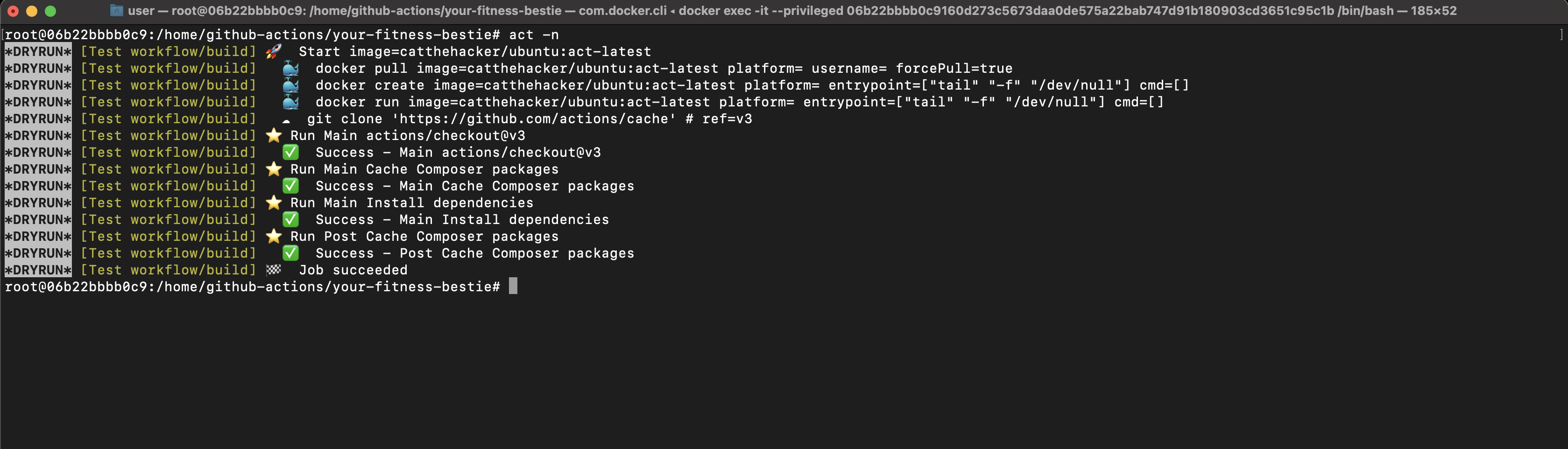 When finished, clone your GitHub repo with the workflow file if you haven’t, and proceed to use Act to run your GitHub Actions locally by running the act -n command to dry run the workflow. You should see the run log: