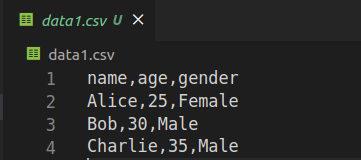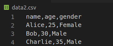 The example code below reads a CSV file named data2.csv using the GoCsv library. We define a struct Record with two fields, Name and Gender, each with a corresponding CSV column specified using struct tags csv:"name" and csv:"gender".