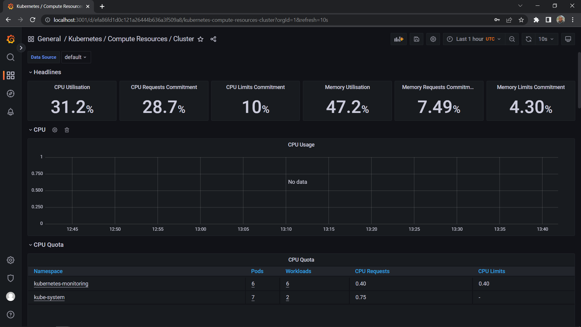 This dashboard shows the CPU usage, CPU request commitment, limitations, memory usage, memory request commitment, and memory limit commitment. It will help you manage and monitor them.