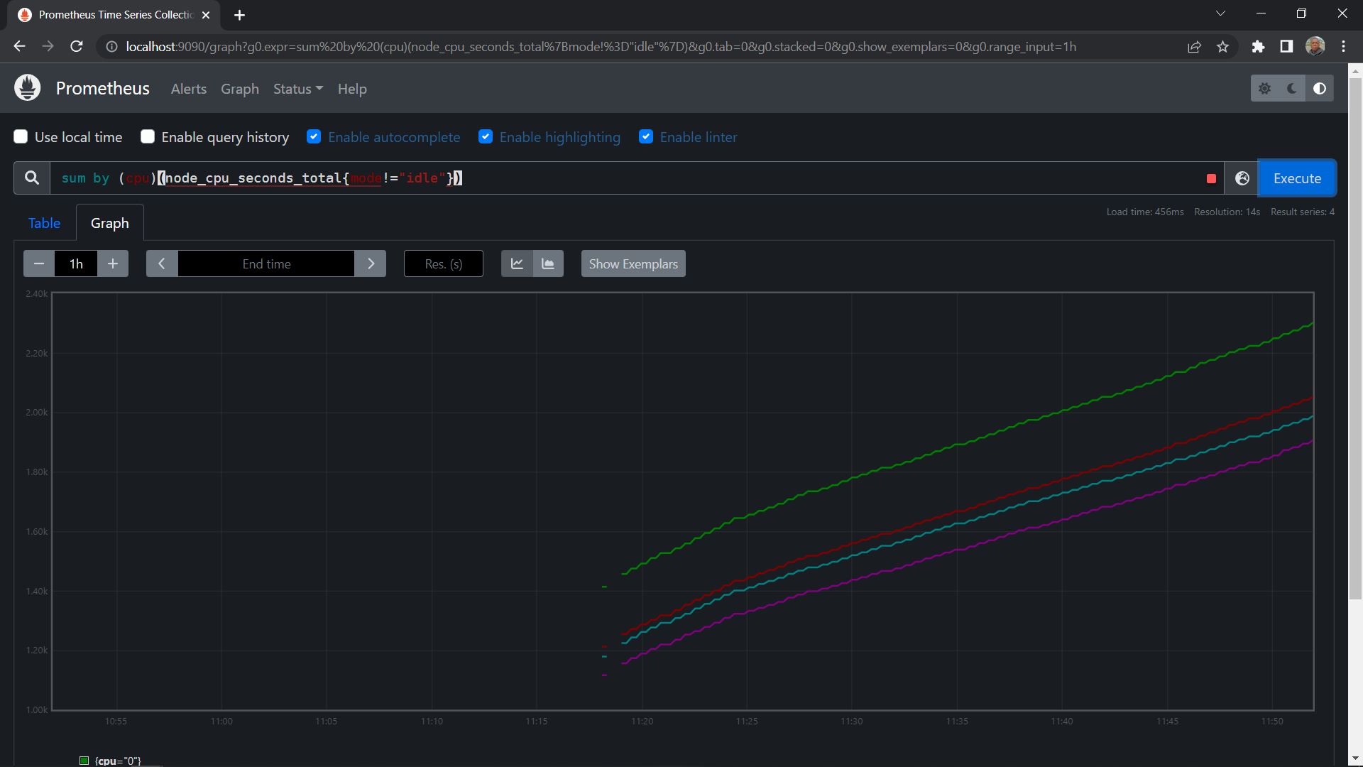 Sum by (cpu)(m=node_cpu_seconds_total{mode!="idle"})