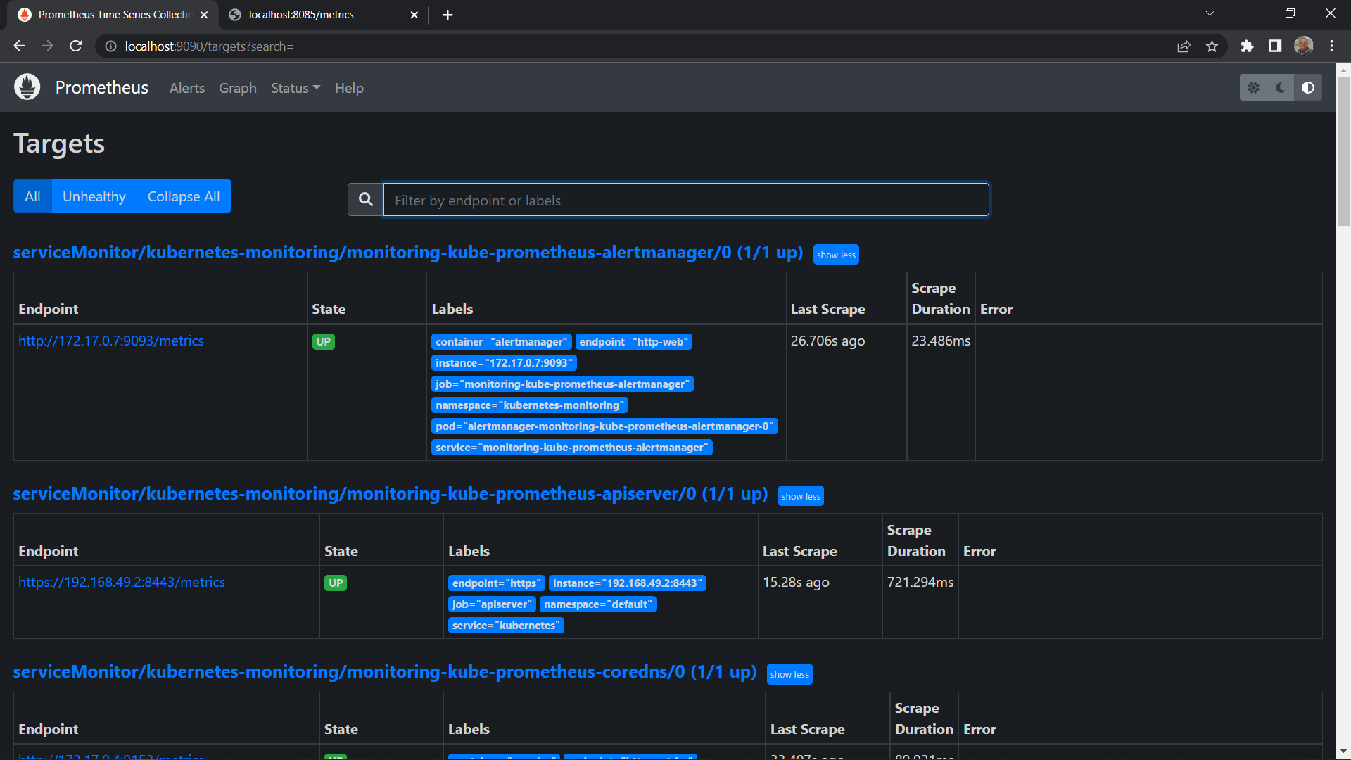 As seen above, many Kubernetes internal and monitoring components are set as Prometheus targets on http://localhost:9090/targets or http://YOUR_SERVER_IP:9090/targets.