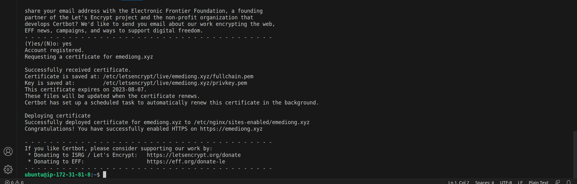 The screenshots above show that the SSL/TLS certificate for the domain emediong.xyz was successfully obtained using Certbot.