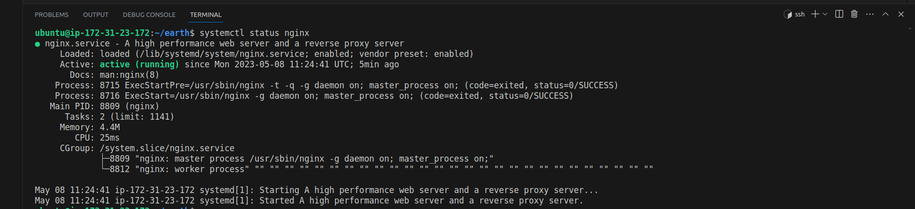 systemctl status nginxYou will see the active (running) message highlighted in green, indicating that the Nginx service is running successfully, as shown in the screenshot below.