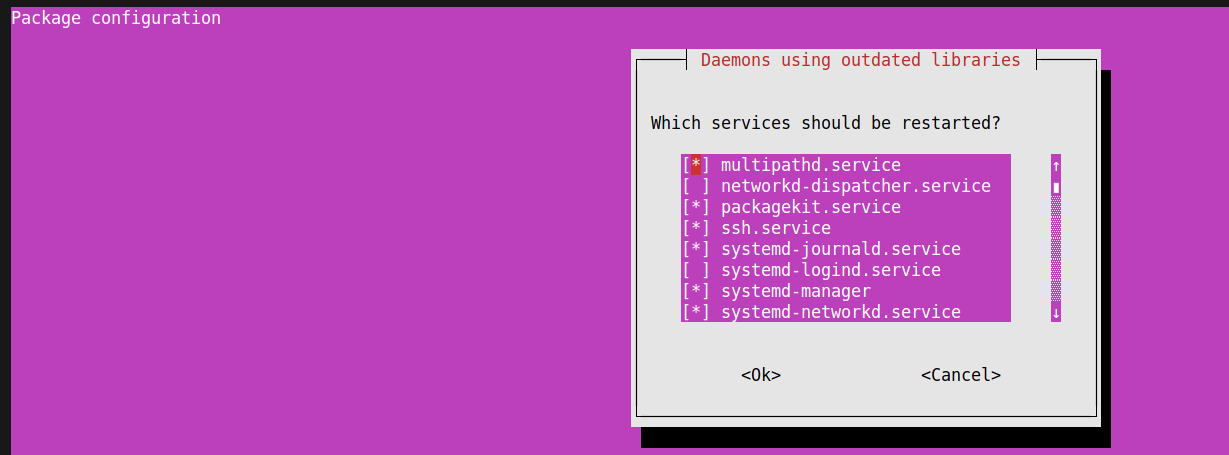 If such prompts appear, press ENTER to allow the default option, which will restart all the services listed in the prompt.