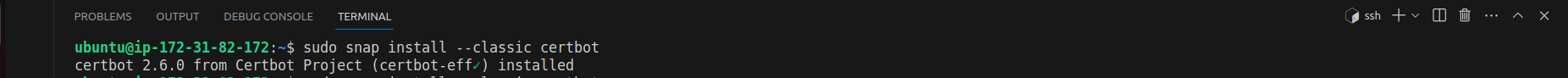 sudo snap install --classic certbotBy enabling the --classic flag support, It installs the Certbot snap package in classic mode, allowing it to interact with the host system and perform tasks such as managing SSL/TLS certificates. The --classic “flag” is typically used for applications requiring deeper system integration.