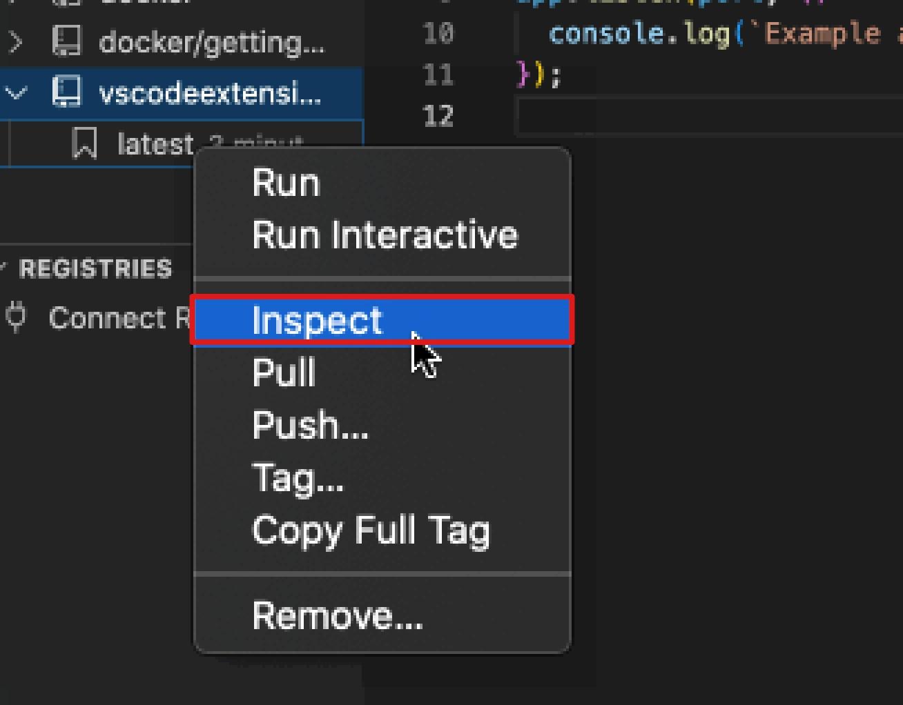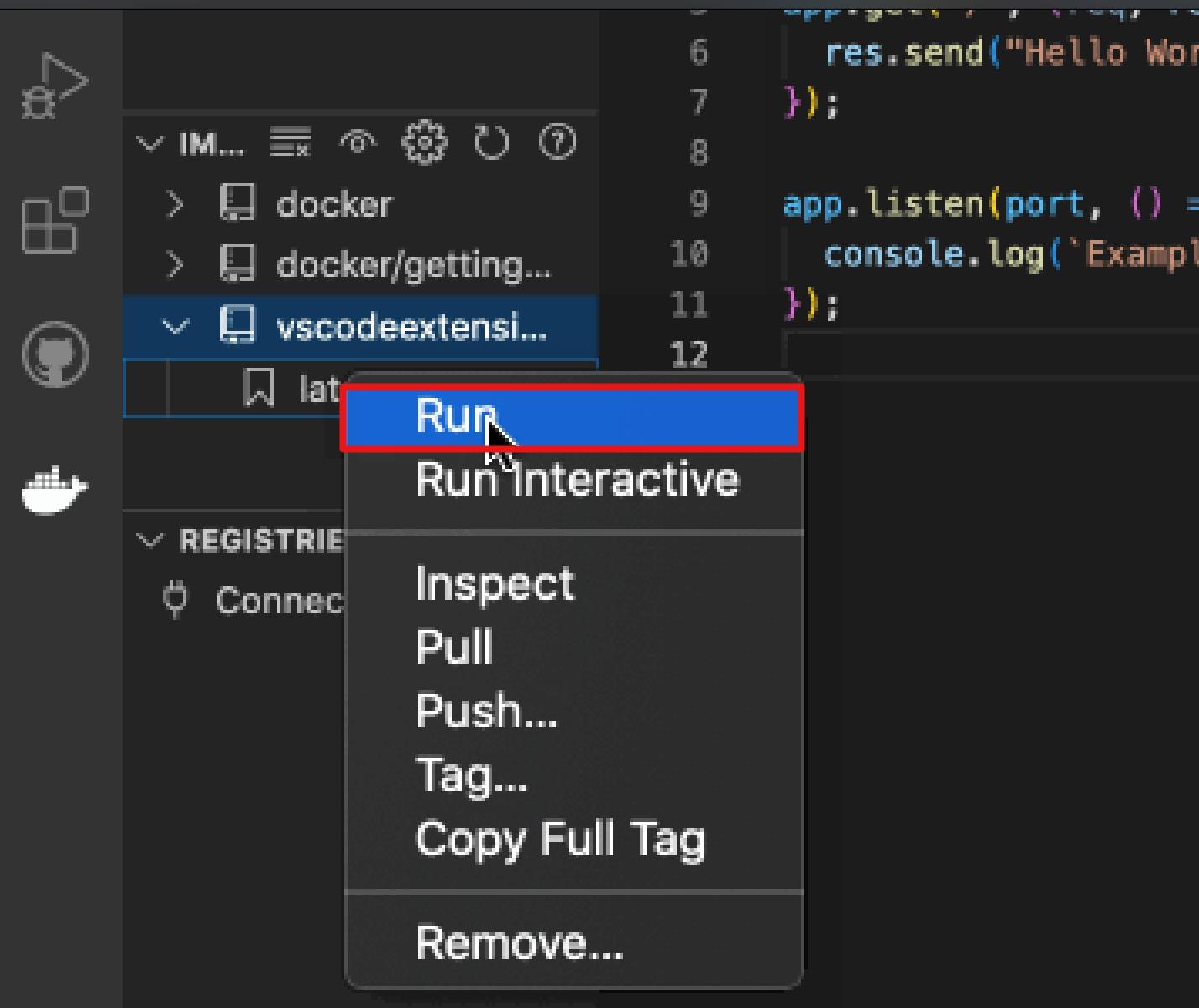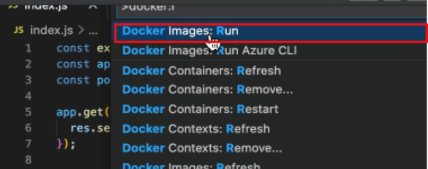 CMD ["node", "index.js"]You’re probably already familiar with Docker, but just to highlight all the things the extension gives you, here’s a brief explanation of what was generated: FROM:Sets the base image to use for subsequent instructions. ENV: Sets the environment variable key to the value. WORKDIR:Sets the working directory to /usr/src/app. COPY: Copies files or folders from the source to the destination path in the image’s filesystem. RUN: Executes any commands on top of the current image as a new layer and commits the results. EXPOSE: Defines the network ports on which this container will listen at runtime. USER:Sets the user name or UID to use when running the image in addition to any subsequent CMD, ENTRYPOINT, or RUN instructions that follow it in the Dockerfile. CMD: Provides defaults for an executing container.