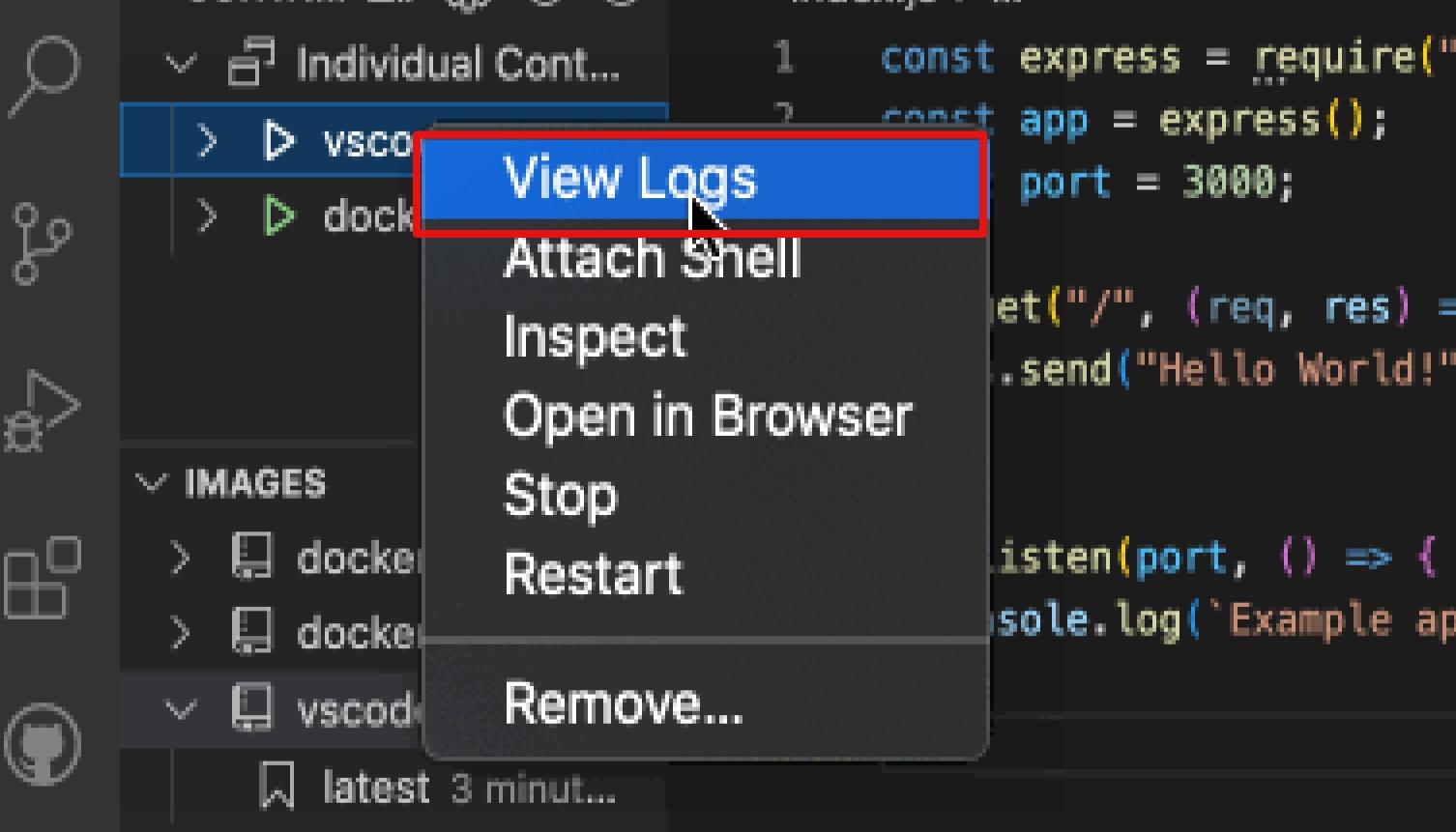 Using the running Node.js container as our example, all you have to do is navigate to Docker Explorer. In the Containers tab, right-click on your container and choose View Logs. You should see it being displayed in the terminal