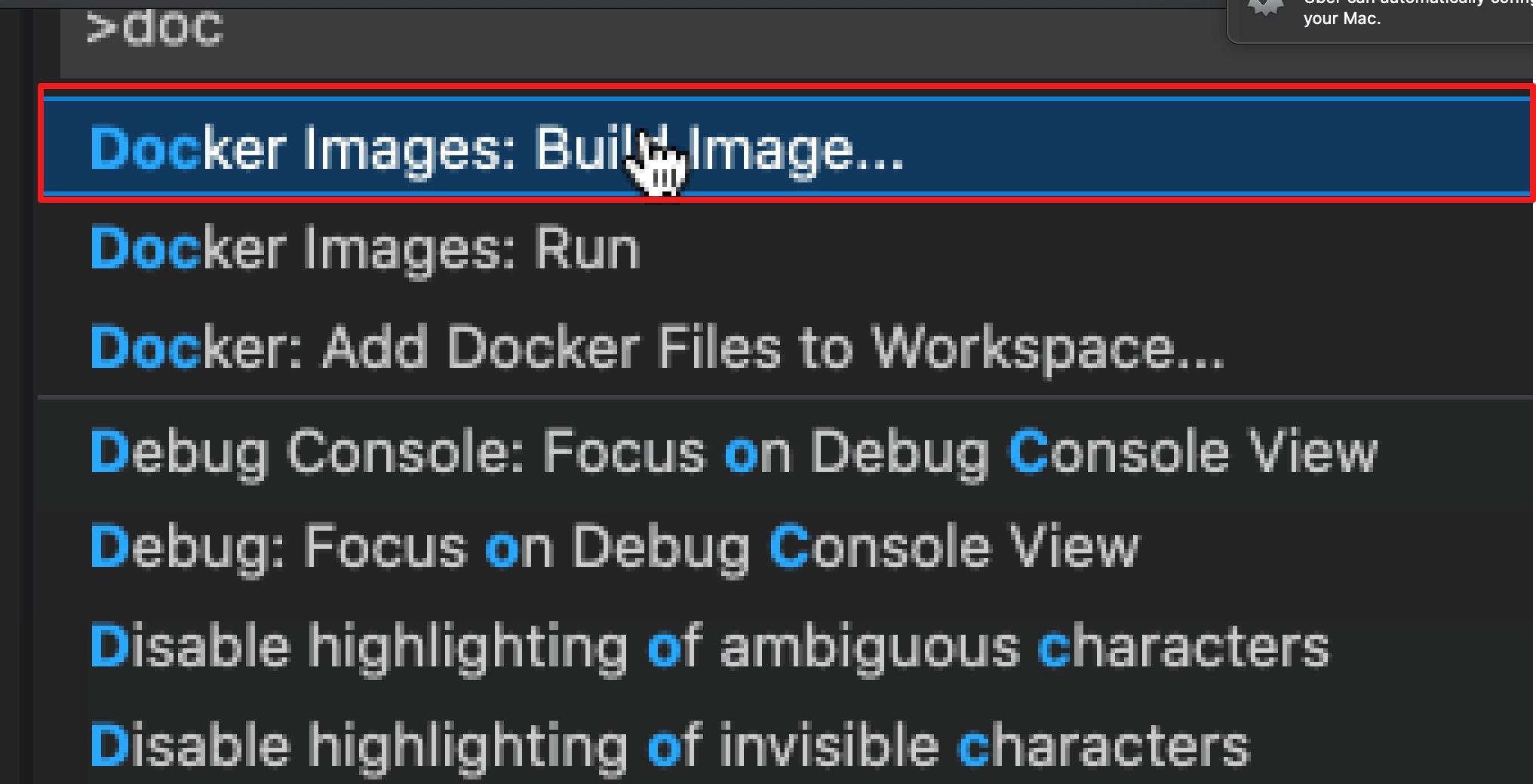 To generate the Docker files automatically, open the Command Palette by pressing ⇧⌘P on a Mac or Control+Shift+P on a Windows PC. Then type: