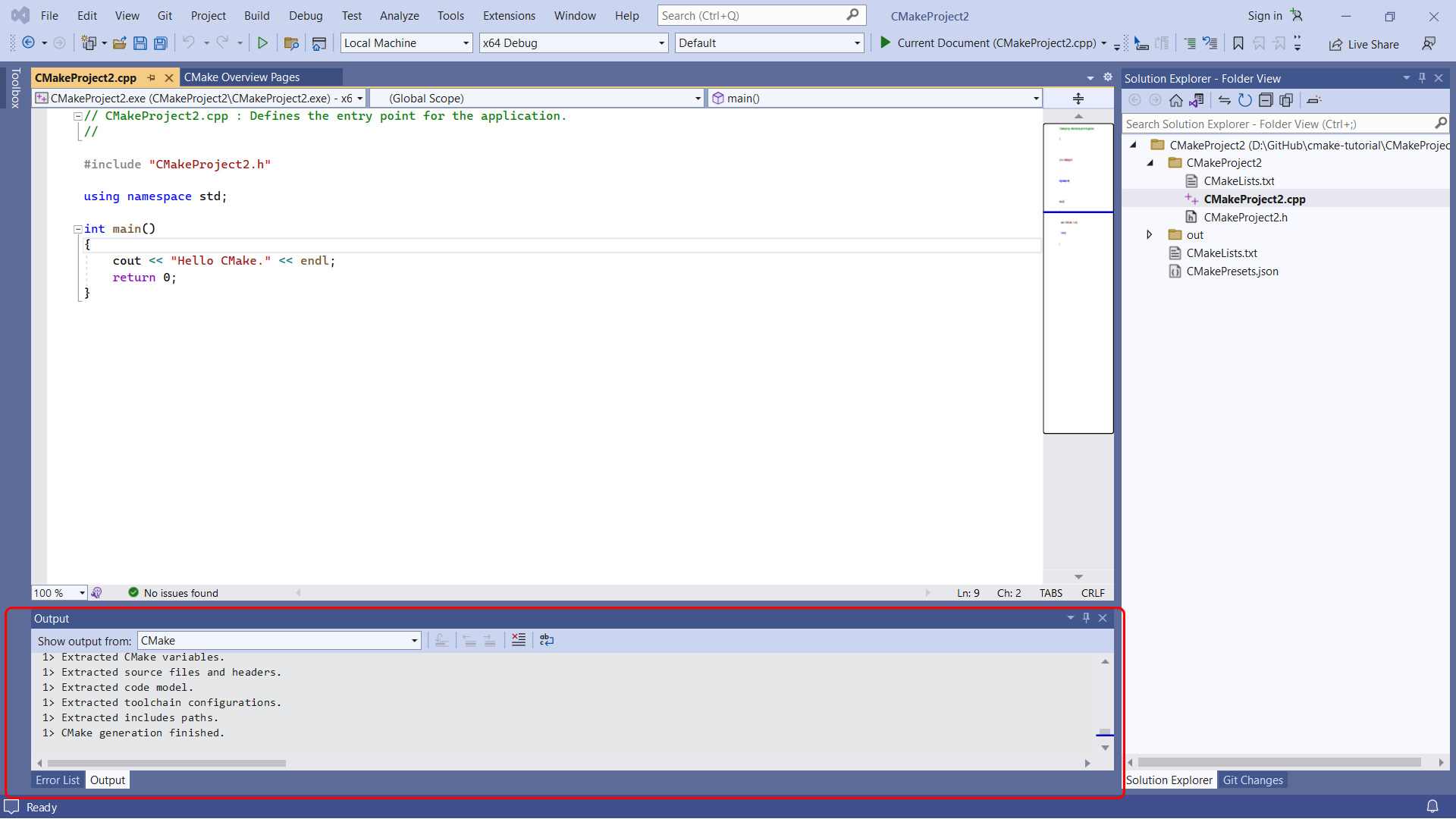 Lastly, you can select Build > Build All from the main menu of Visual Studio to build your CMake project: