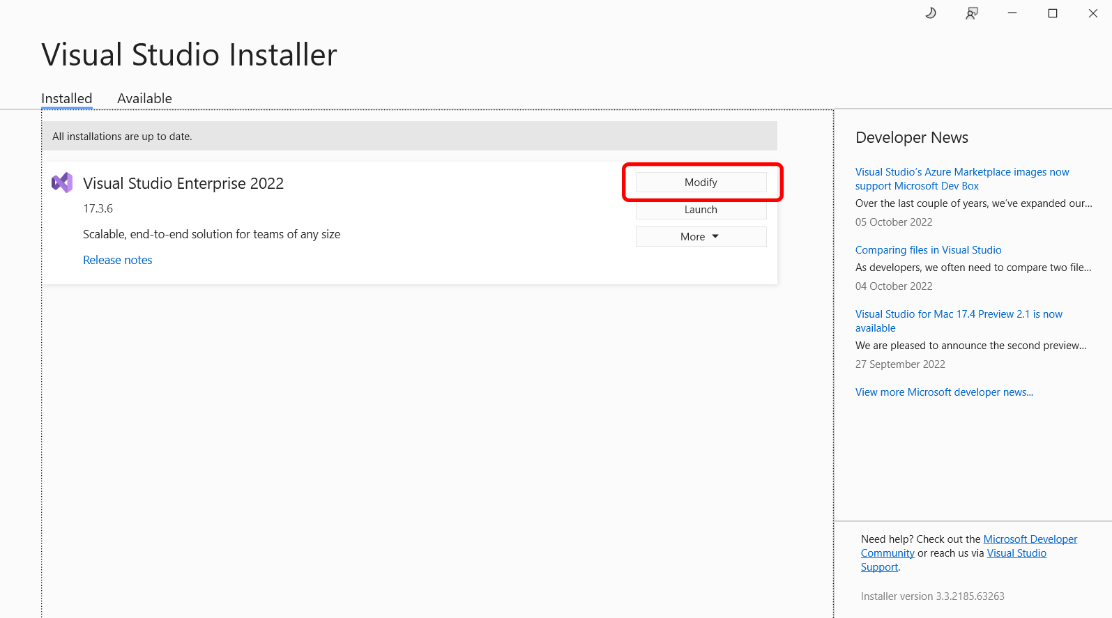 Once the Visual Studio Installer loads, select Modify: