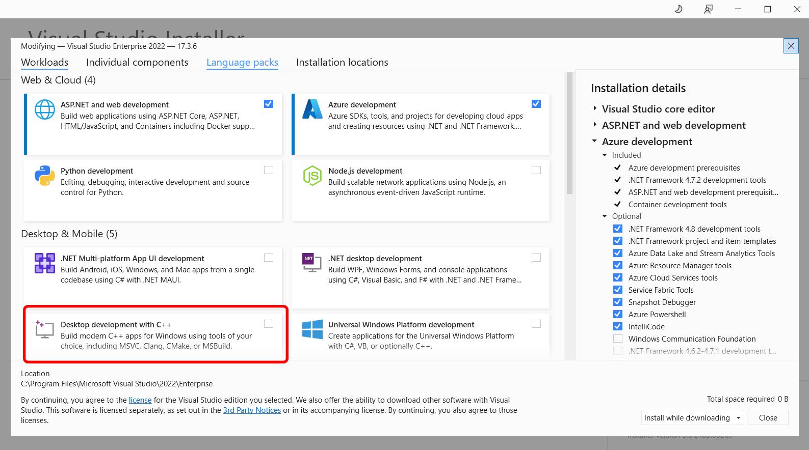 Under Workloads, locate Desktop development with C++, which can be found under Desktop & Mobile: