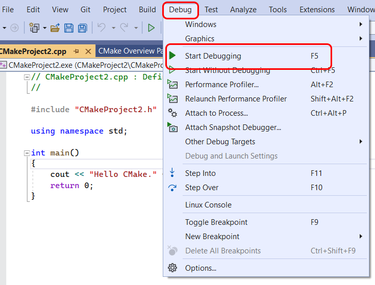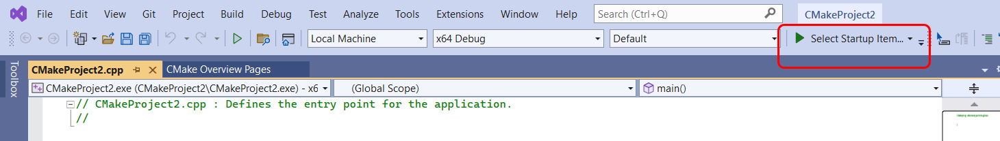 To debug your CMake project using Visual Studio, start by selecting one of the targets shown in the Startup Item drop-down within the toolbar: