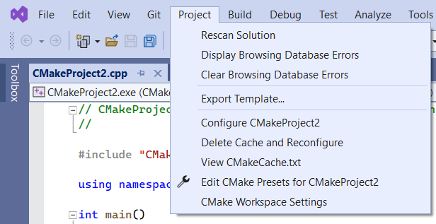 When Visual Studio detects that there is a CMakeLists.txt file within a project that’s been opened, it adds CMake items to the Project menu, which gives you access to commands for viewing and editing CMake scripts: