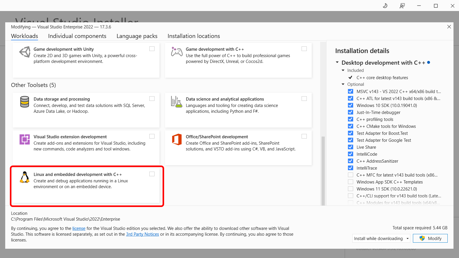 On this same page, you also need to find and select the Linux and embedded development with C++ component. This component ensures you have cross-platform CMake development capabilities: