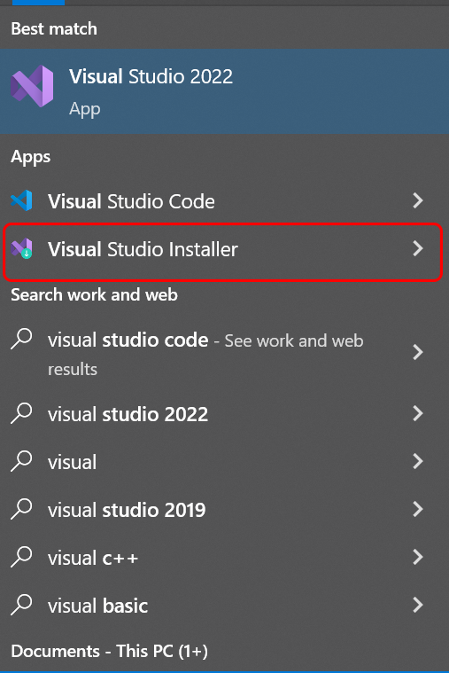 To install the CMake extension, you need to select Start and then open the Visual Studio Installer from the menu: