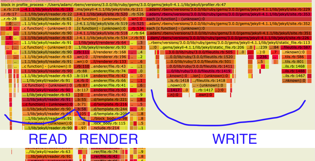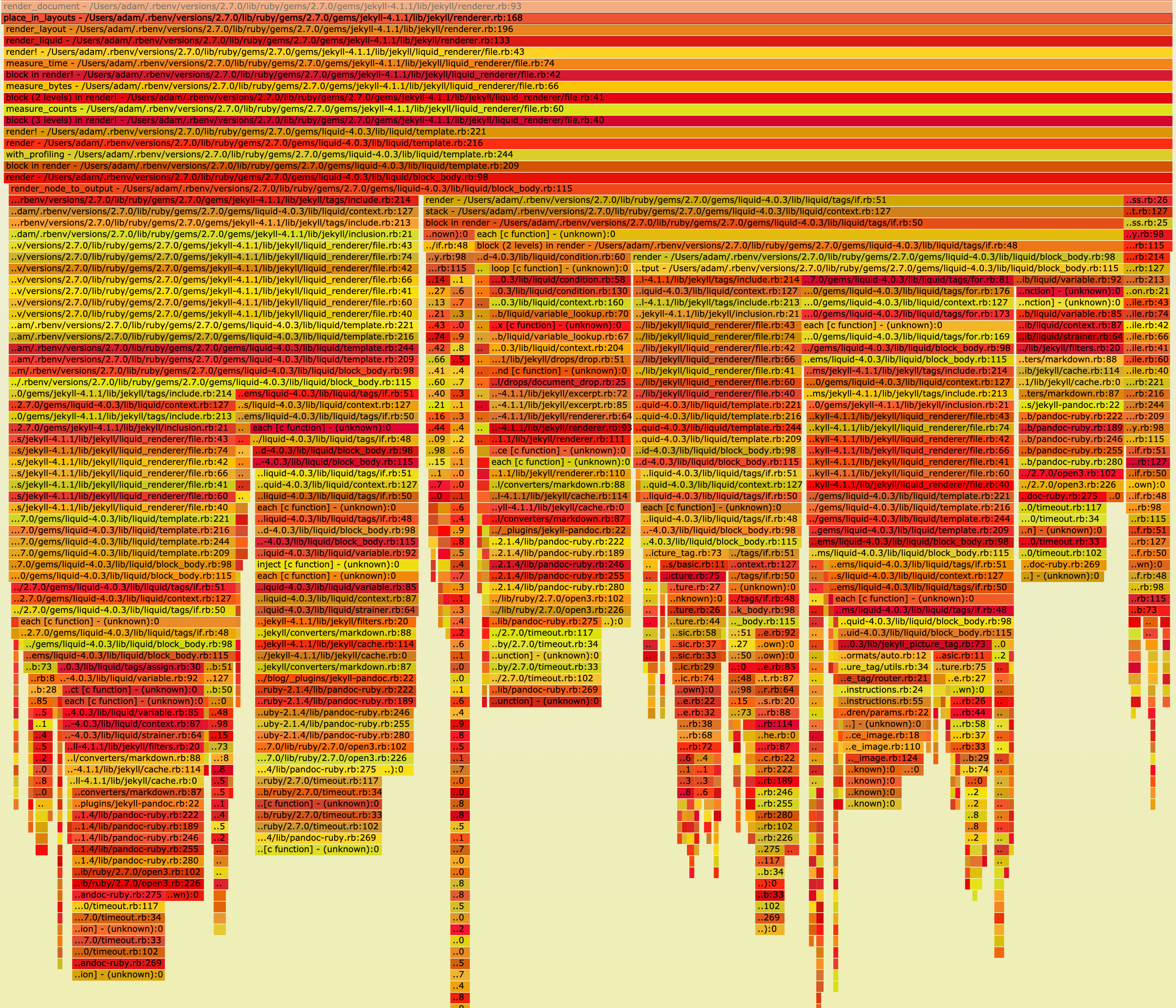 To dig into this, let’s take a look at a flame-graph of the Jekyll build for this blog using RubySpy: