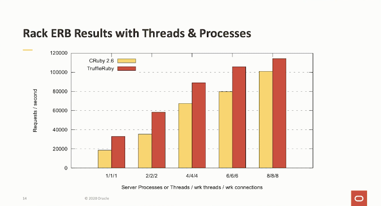 This chart comes from Benoit Daloze1, the TruffleRuby lead. The benchmark in question is a long-running server-side application using a minimal web framework. It is in the sweet spot of the Graal and TruffleRuby, with little code to JIT and much time to make up for a slow start. But even so, MRIRuby does well.