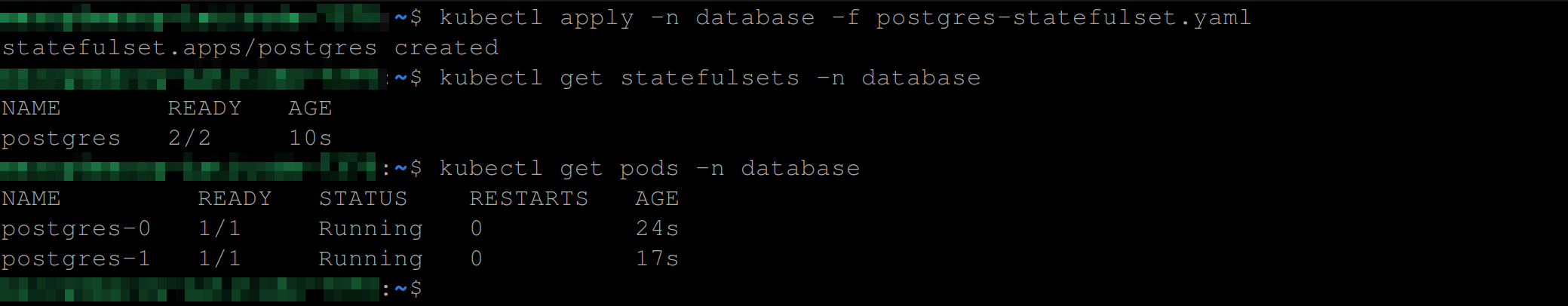 The image below shows that the Postgres StatefulSet is being created with the 2 replicas (pods) up and running: