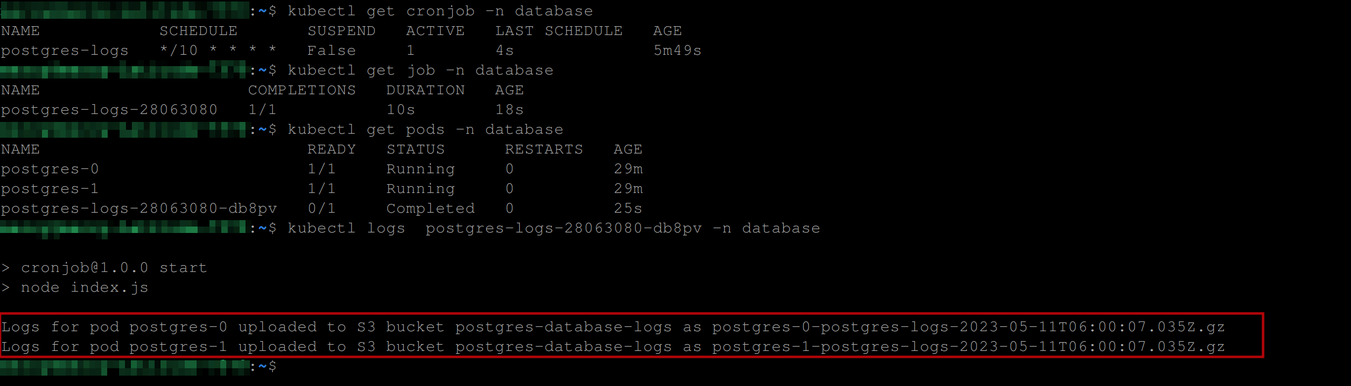 You can see from the image above that the job retrieved the logs from Postgres, compressed them, then uploaded the logs of the two replicas postgres-0 and postgres-1 created by the Postgrestatefulset and uploaded them to your AWS S3 bucket.