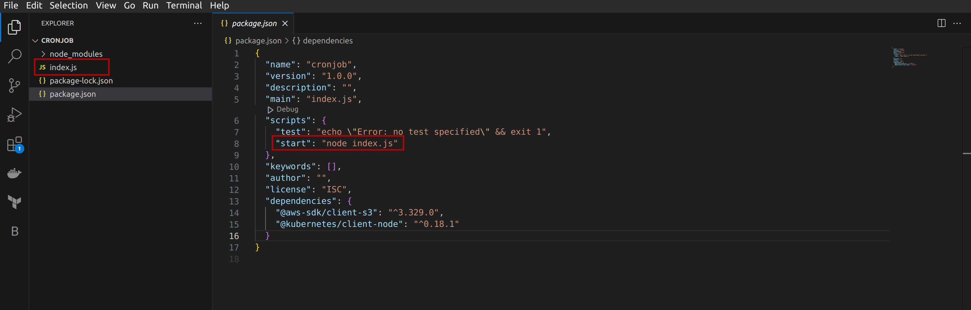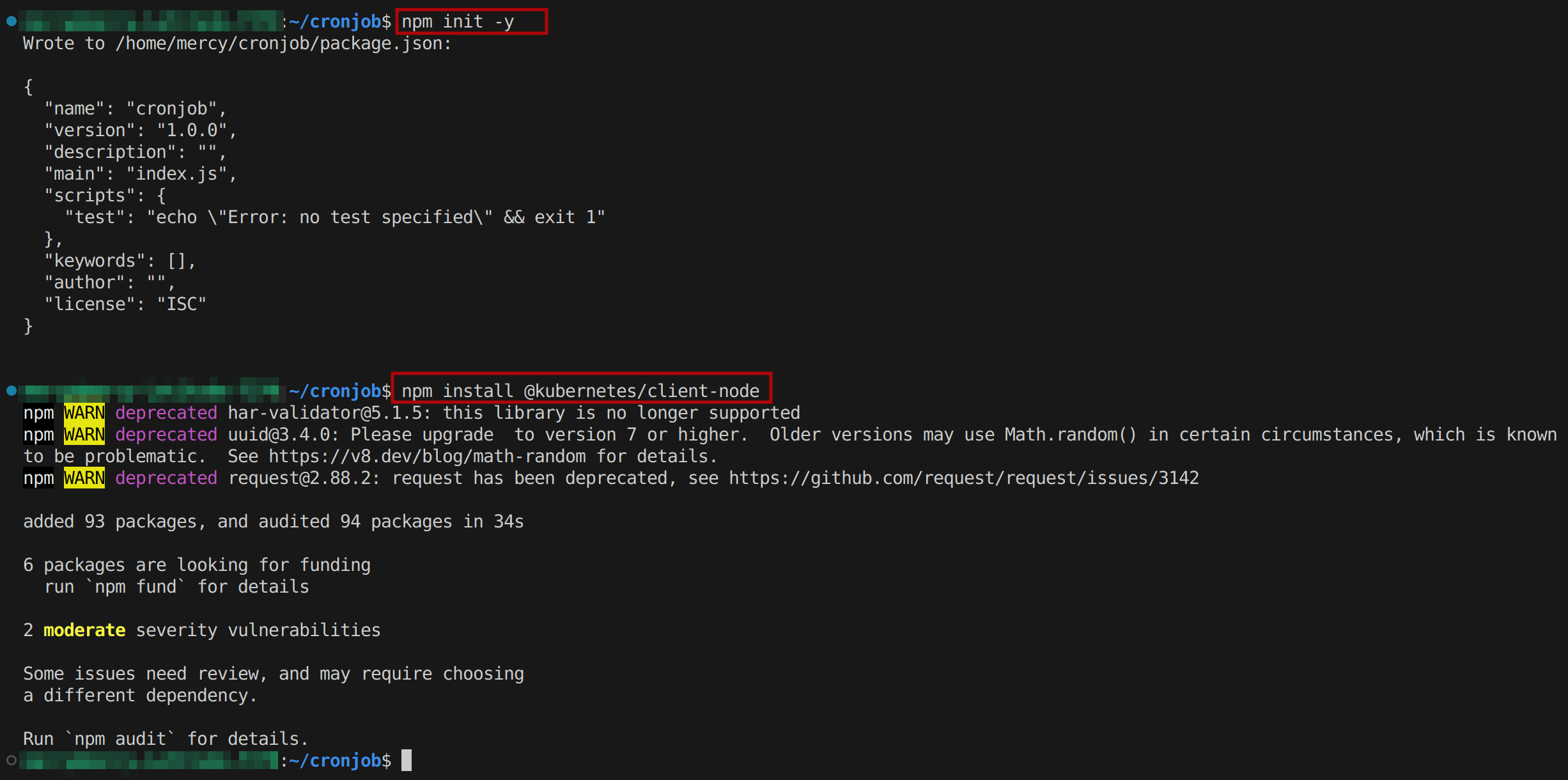 cd cronjobInitialize a NodeJS project and install the NodeJS Kubernetes client library with the following commands: