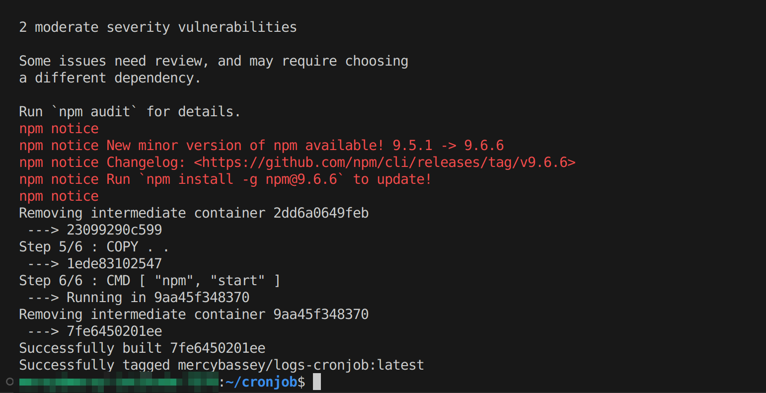 retrieveLogs().catch((err) => console.error(err));Dockerizing the Script and Deploying to DockerHub