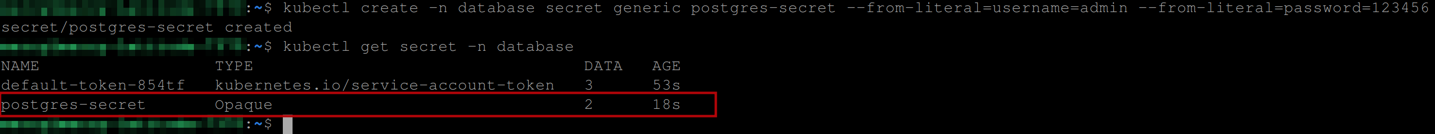 Execute the following line of code to create a Kubernetes secret object in the databse namespace. This Kubernetes secret will store a username and password for the PostgreSQL database securely. This is the secret we’ll use in our PostgreSQL Statefulset, later on, to authenticate with the PostgreSQL database server.: