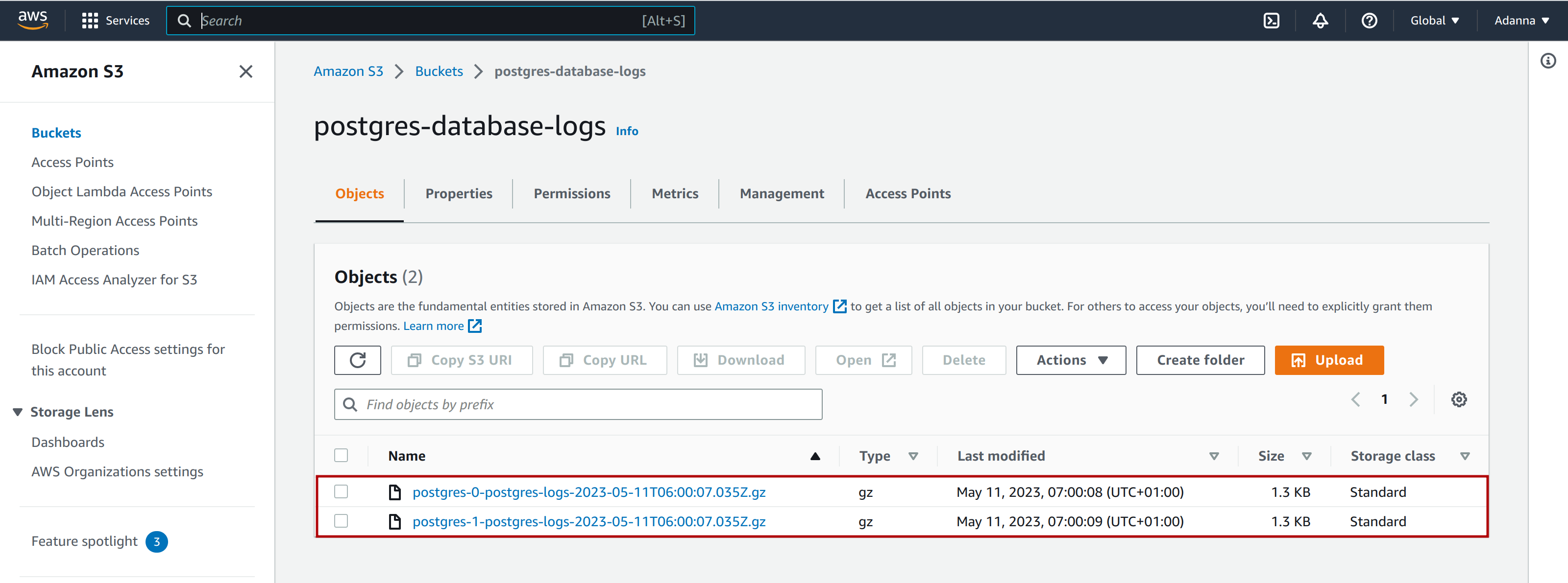 postgres-database-logs. - An AWS IAM user with permission to interact with the S3 bucket.