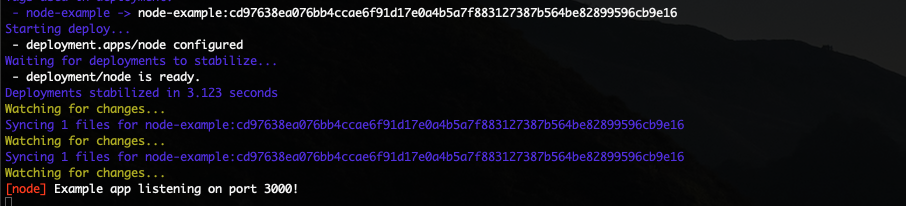 The image below shows a Node.js application driven by Skaffold: