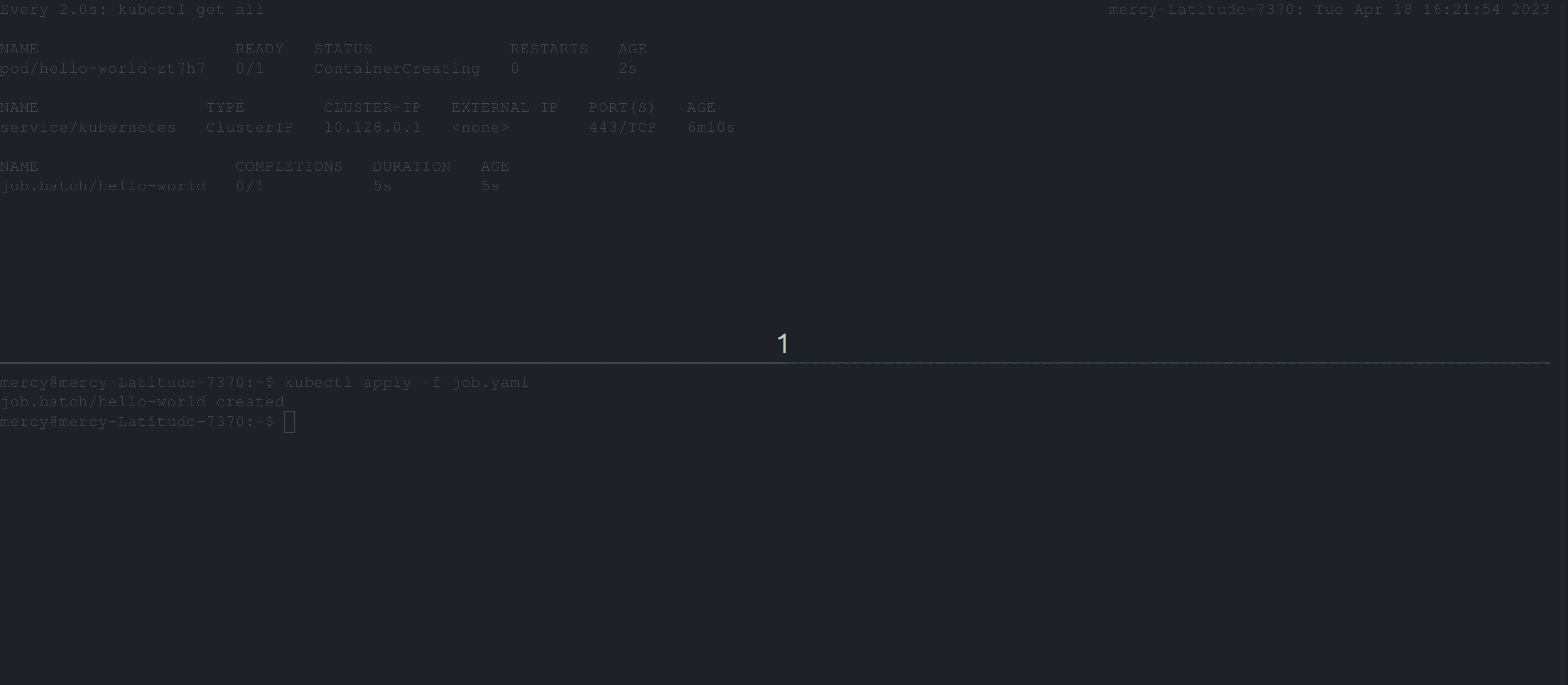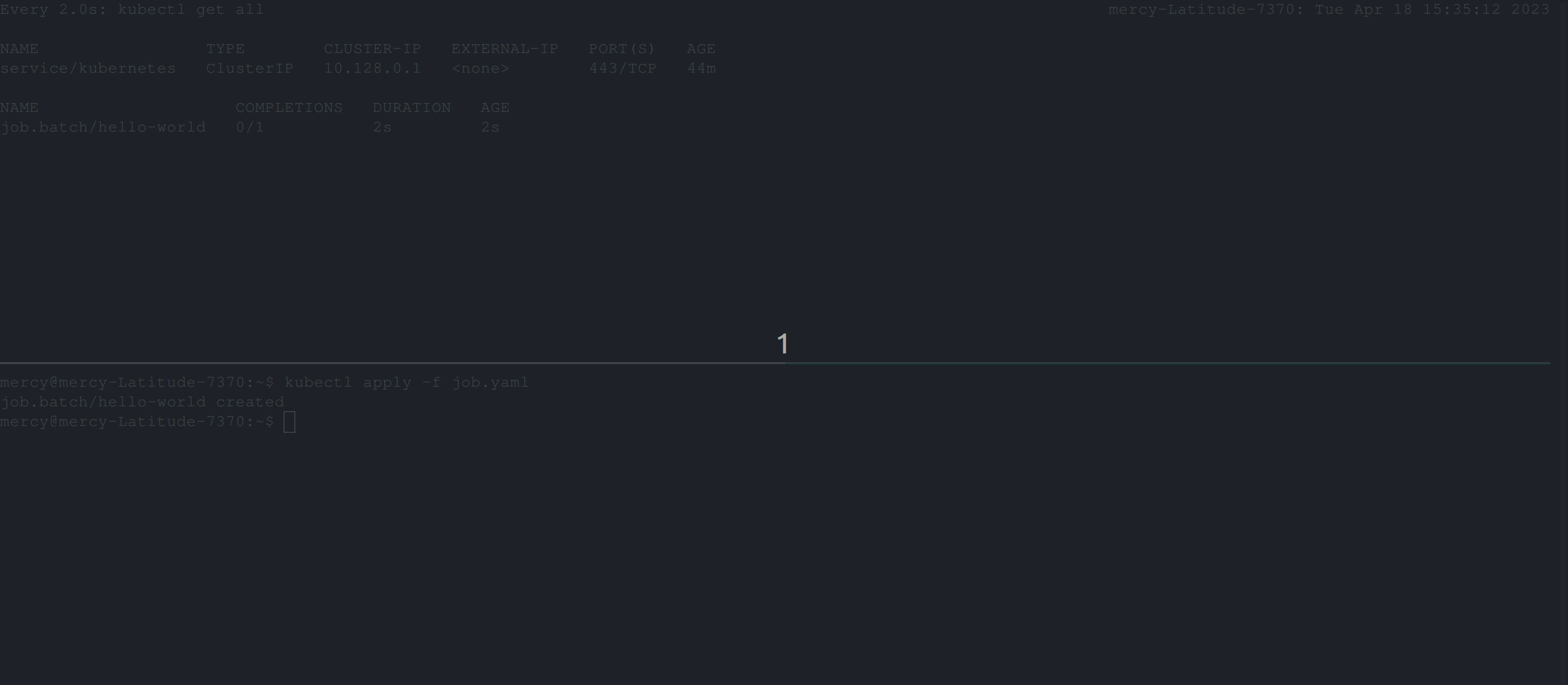 Divide your terminal into two segments (you can use tmux), and run the following command watch kubectl get all on one segment and execute the kubectl apply -f <your-job-specification-manifest-file> on the other segment, like the clip below; this process aims to see how a job gets created: