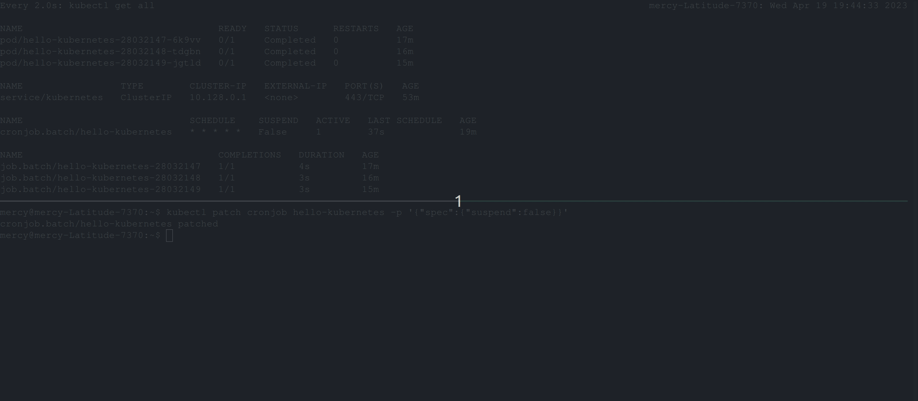 You can see from the clip above that the pod created by the hello-world job gets recreated after deletion because it hasn’t run to completion.