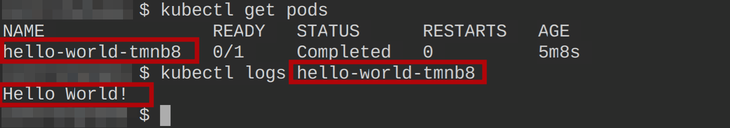 kubectl logs <name of the pod>From the image below, you can see that the job created a pod that echoes Hello World!.
