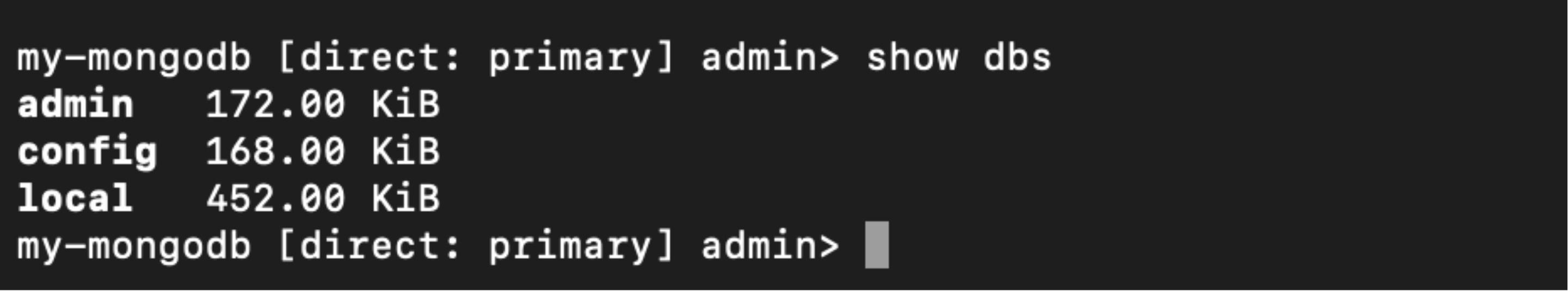 You have now established a connection to the MongoDB cluster. Let’s list the databases that are currently available: