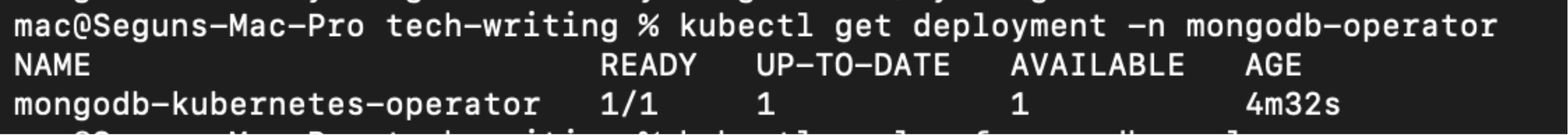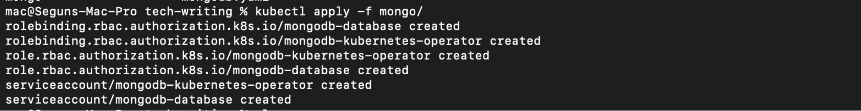 You now have the required roles and permission for the operator to use, the next step is to deploy the MongoDB operator. To do run the following commands: