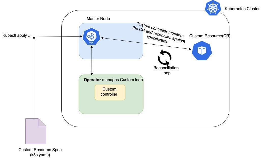 A Kubernetes operator at its core has the same control loop mechanism as Kubernetes that monitors changes to the application state. They typically consist of the following components: