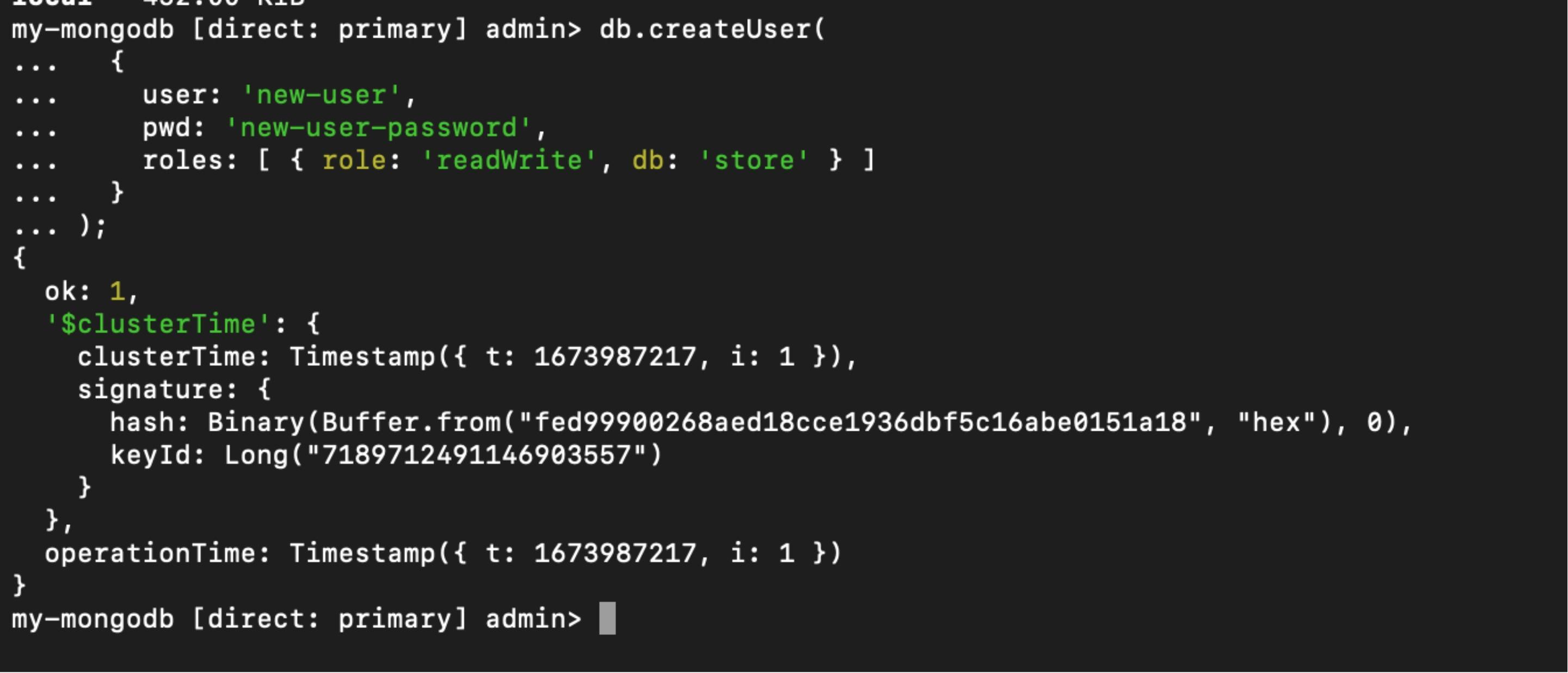 This command creates a new user in the MongoDB database with username “new-user” and password “new-user-password”, and assigns the “readWrite” role to the user on the “store” database. This allows the “new user” to have read and write permissions on the store database.