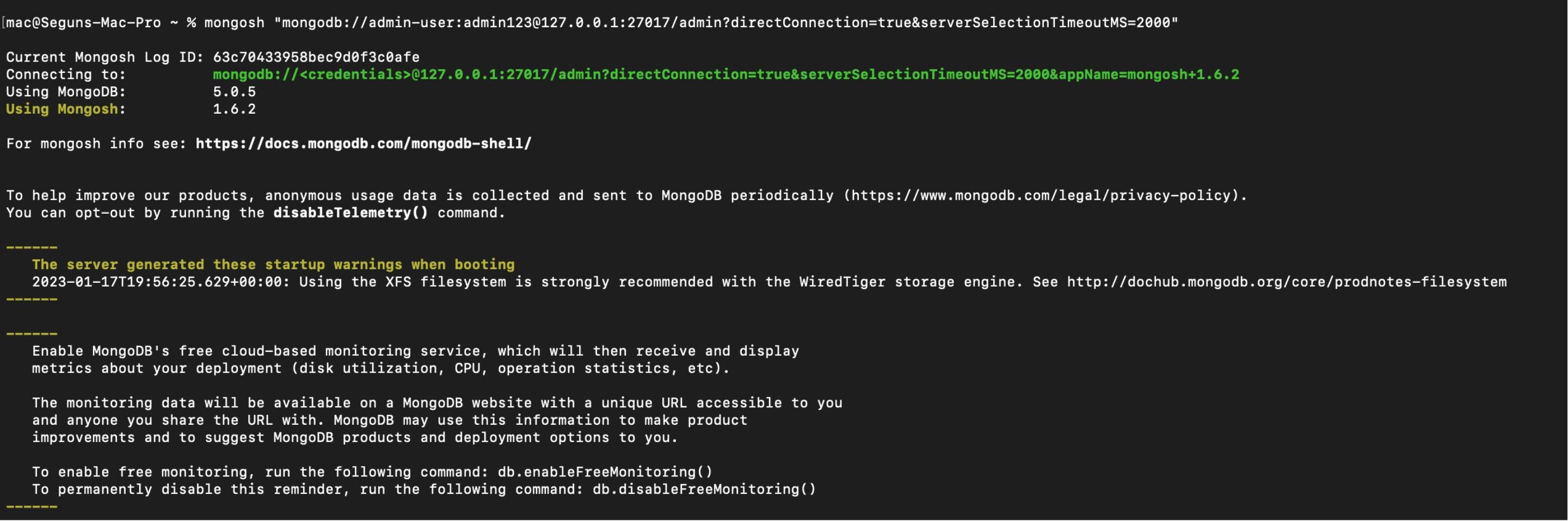 Mongosh "mongodb://admin-user:admin123@127.0.0.1:27017/admin?directConnection=true&serverSelectionTimeoutMS=2000"