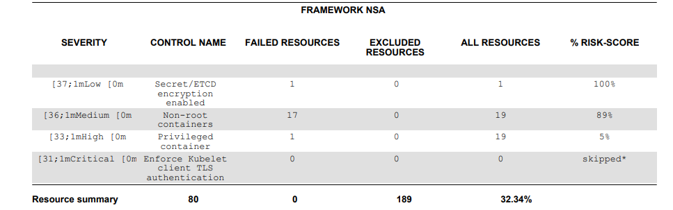 $ kubescape scan framework nsa --submit --format pdf --output nsa.pdfYou will get the following output: