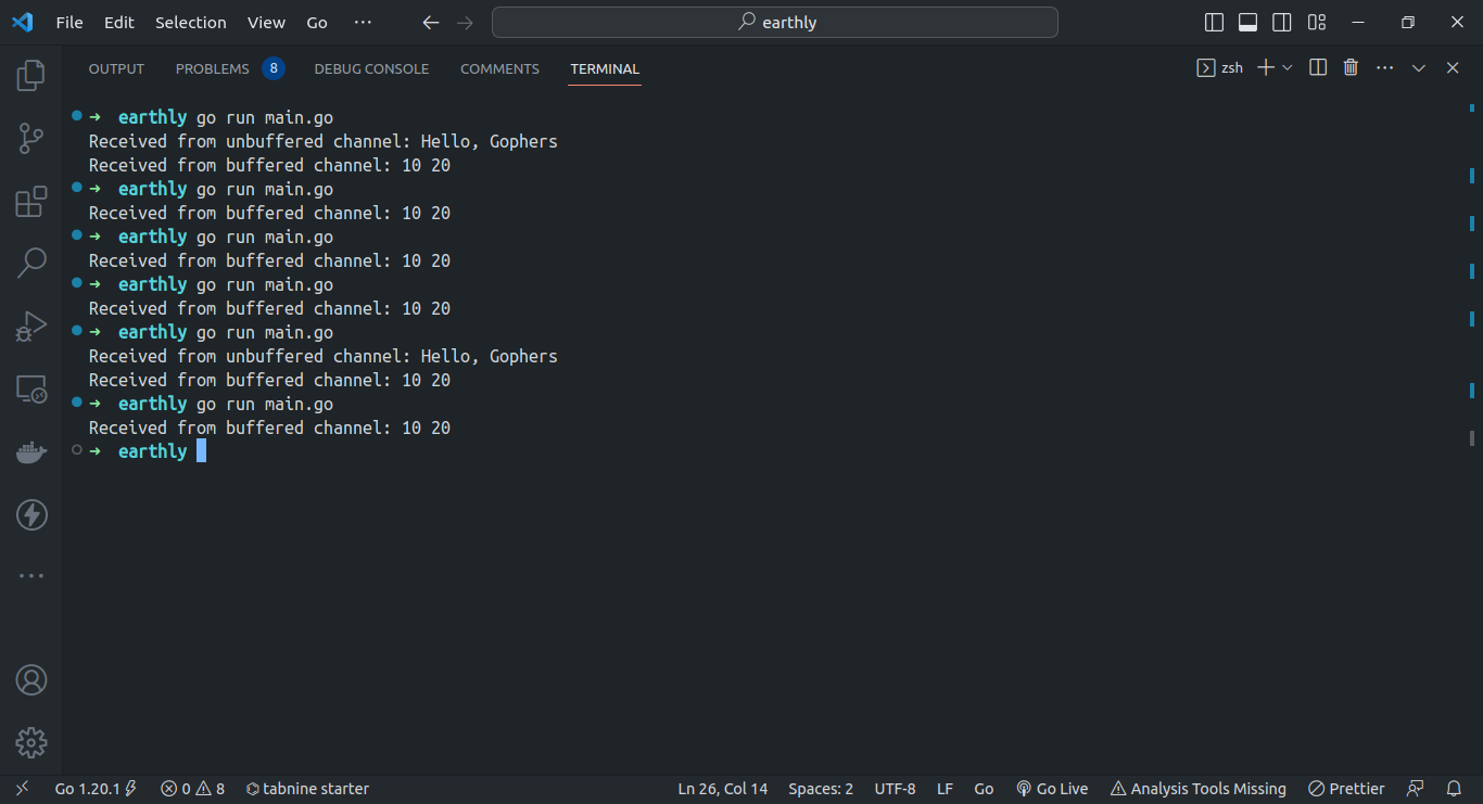 time.Sleep(time.Second)Values 10 and 20 are sent to a buffered channel using the <- syntax. Meanwhile, an unbuffered channel uses a goroutine to assign received values to a data variable. A brief delay, added via the time package, ensures the goroutine completes before the main function ends: