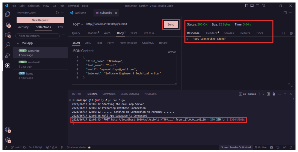 In this section, you will test the API’s main functions, which include registering new subscribers and sending emails to them. Ensure that the API server is operational and connected to the database. And test each previously created HTTP request individually.