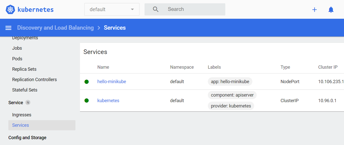 hello-minikube NodePort 10.106.235.150 <none> 8080:30320/TCP 6m53sOnce deployed the Kubernetes dashboard will be filled with the deployment and service created information: