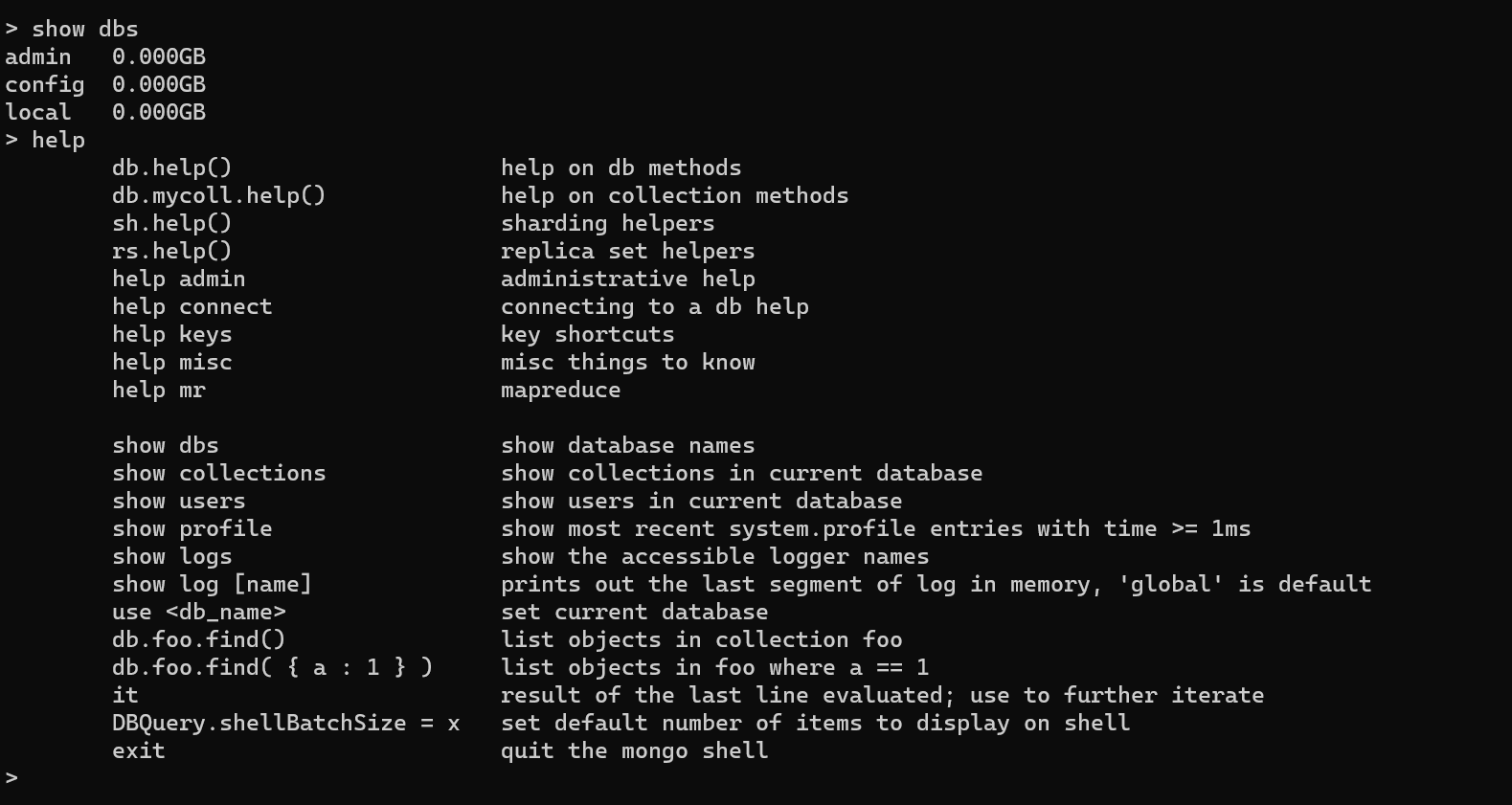 The show dbs command will display all your existing databases. Here, you have the admin, config, and local databases, which are empty initially. For details on the different functions that are available from the shell, type “help”. This will provide a list of some of the database methods available, including commands to display the database’s collections and information.
